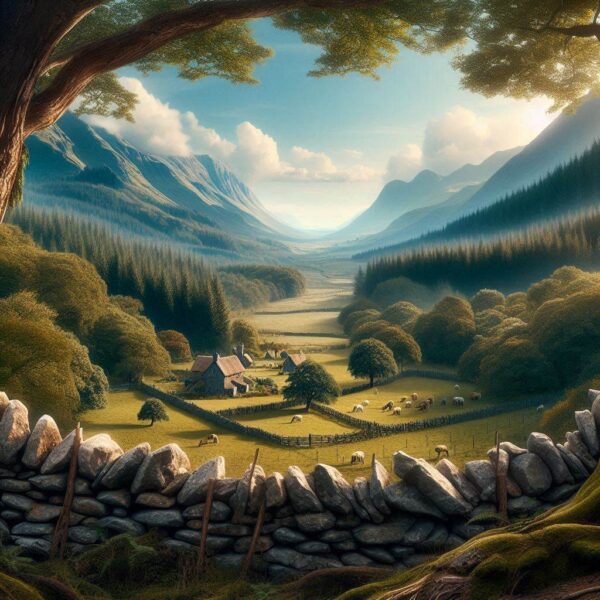 - A view of a farm in a valley over a stone wall. There are woods on the slopes of the valley.
