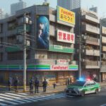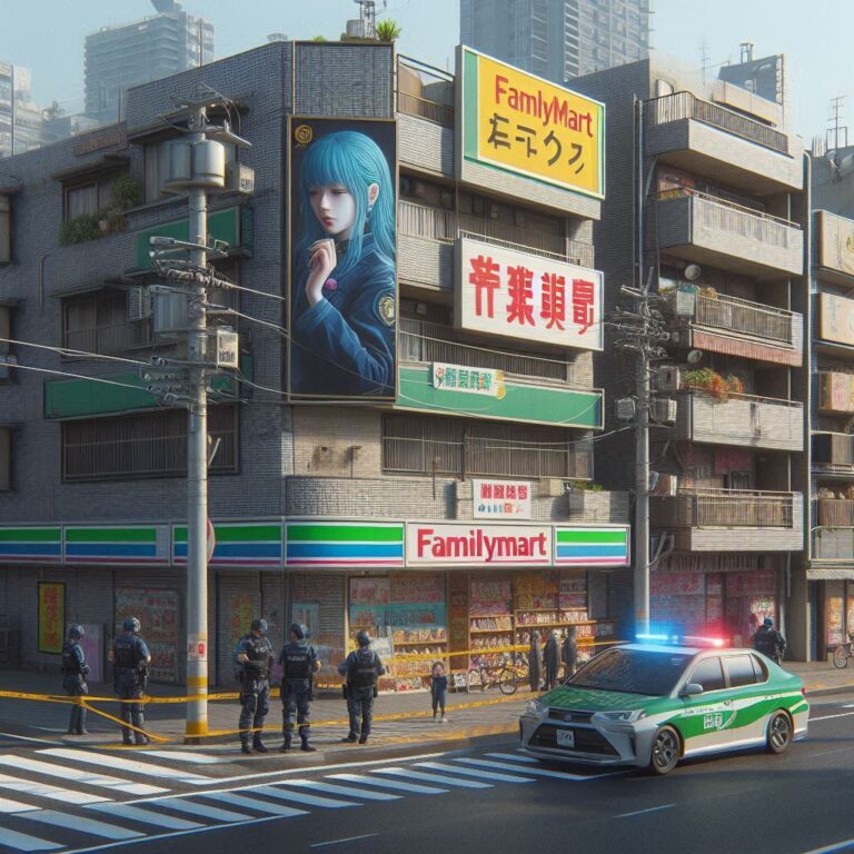 - A view of a small supermarket surrounded by a police cordon. The supermarket is on the corner of a T junction and has three floors of apartments above.