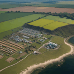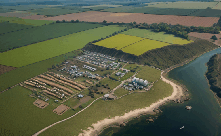 - A clean view of an agricultural town from a few thousand feet above. A wide river is flowing from the top of the image to the bottom of the right hand side of the image while the town is surrounding by farm fields.