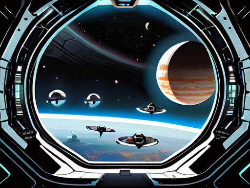 (concept art)++, , (sleek futurism)++, (textured 2d dry media)++, metallic highlights, digital painting style, View through a space station viewport of only a distant gas giant with many starships visible next to the gas giant forming up into a fleet